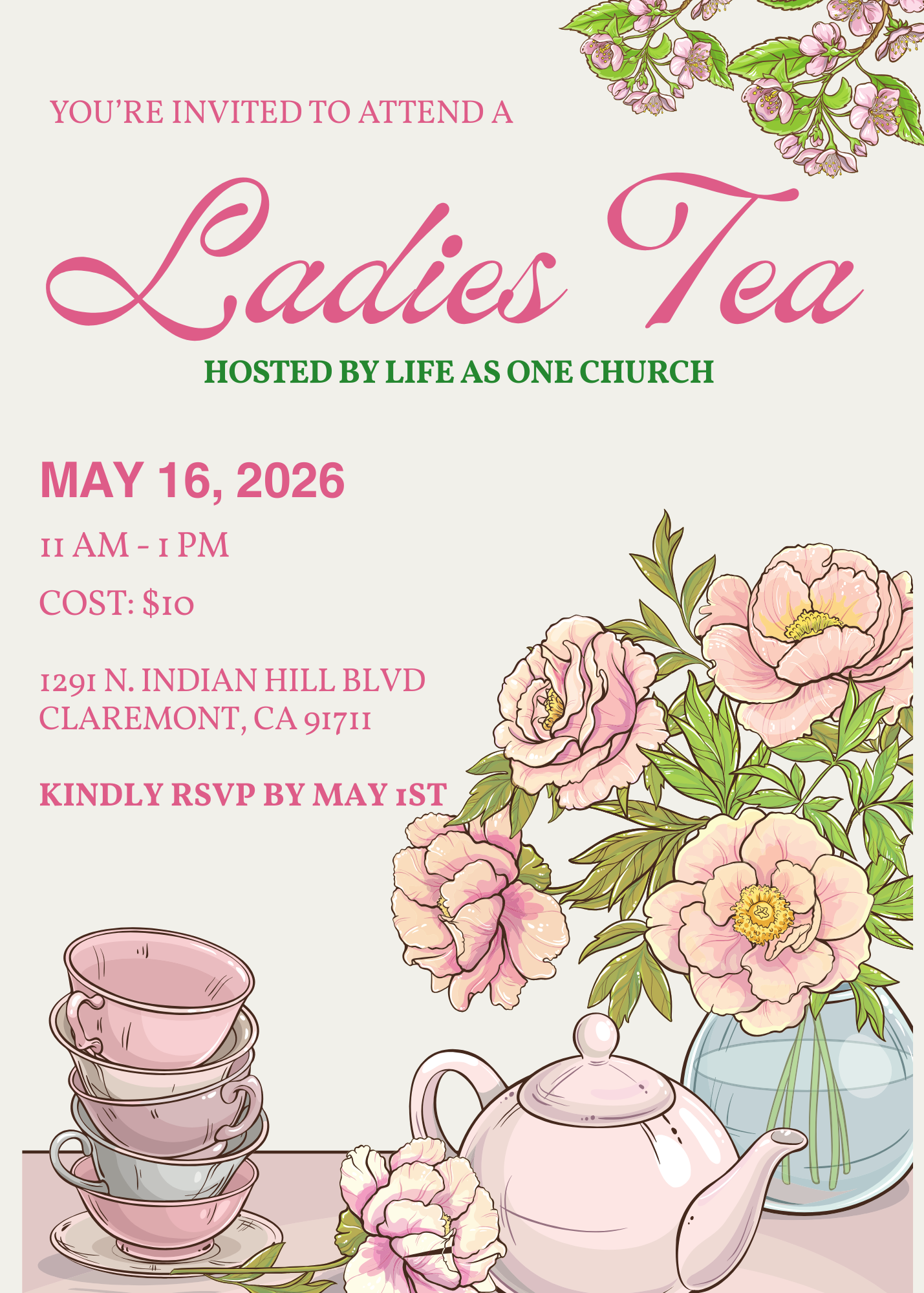 Back to All Events Ladies Tea Party Saturday, May 16, 2026 11:00 AM 1:00 PM Google Calendar ICS Saturday May 16 11:00a-1:00p We invite you to our Ladies Tea event on Saturday May 16th 11AM. This will be a lovely time sharing stories and fellowship as we encourage one another in Christ. RSVP is a must by May 1st. The fee is $10 - paid by May 1st at church. For questions, contact us via email - admin@lifeasone.org